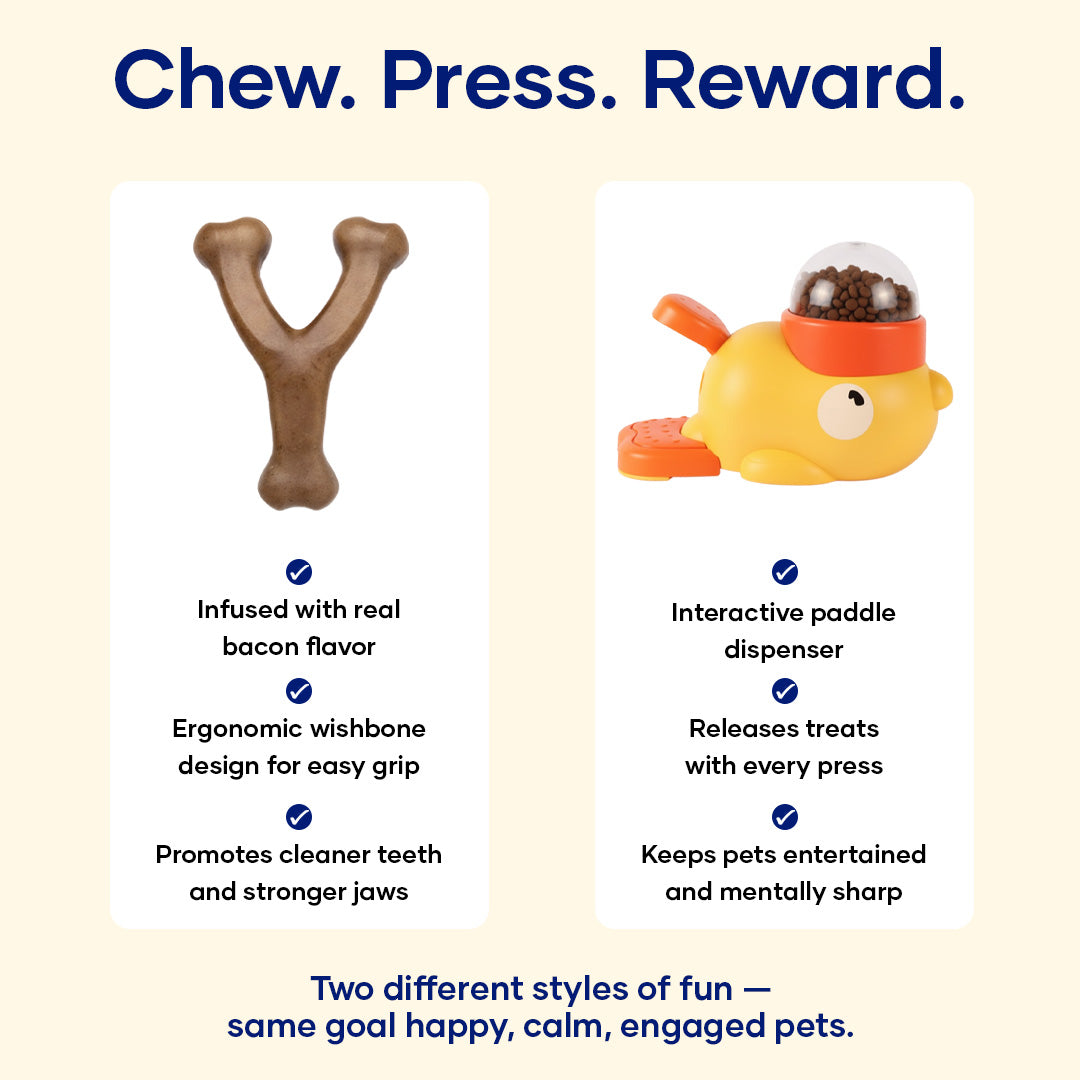 Double the fun, double the engagement! The Aniwell Chew & Play Bundle combines two pet favorites — the Aniwell Wishbone and the Aniwell Interactive Duck Toy. From satisfying natural chewing instincts to stimulating your pet’s problem-solving skills, this duo keeps boredom and anxiety at bay. Whether it’s chew time or treat time, your furry friend gets hours of safe, healthy, and interactive play every day.
