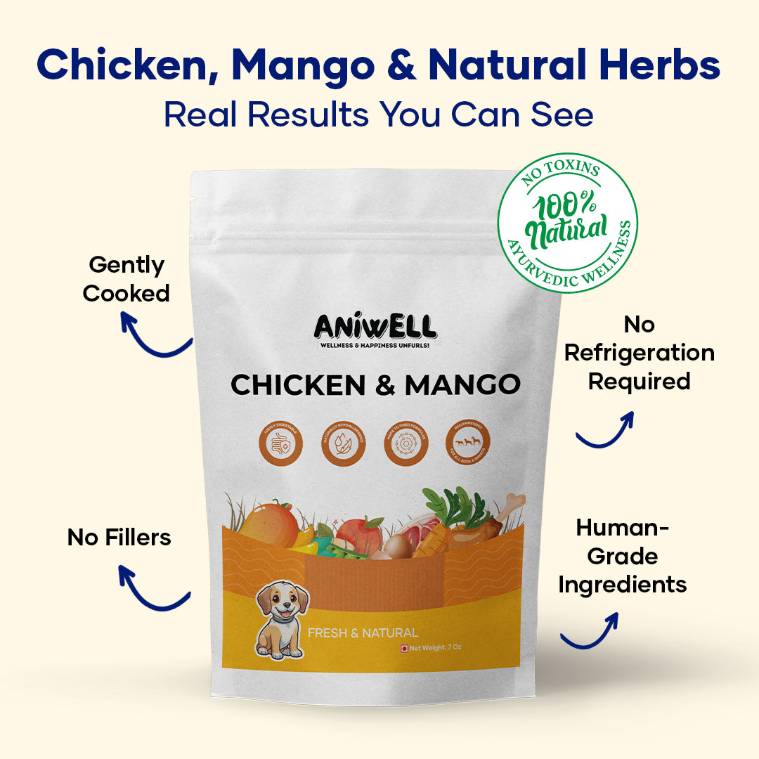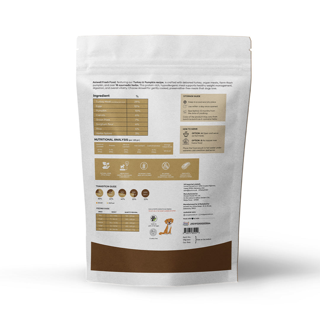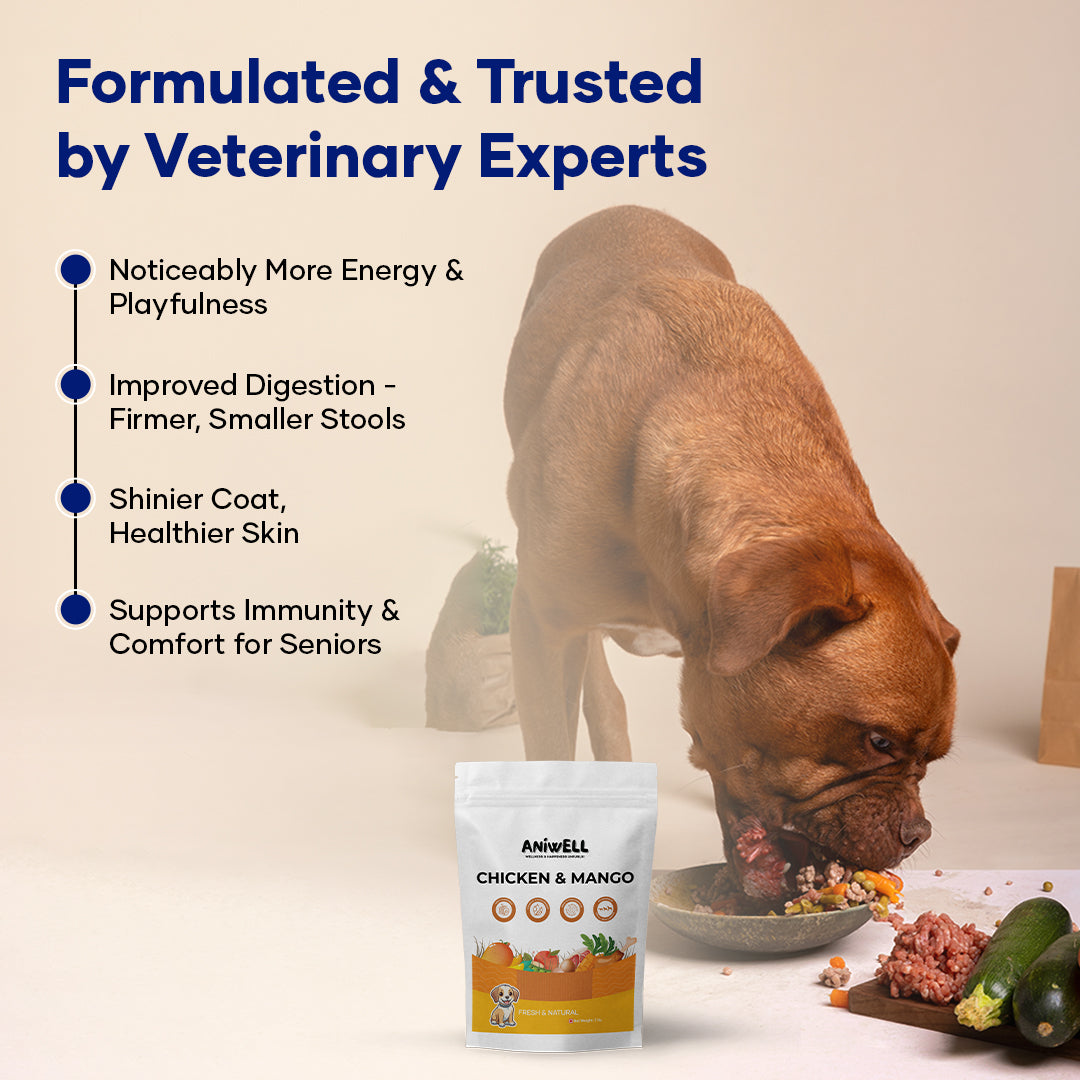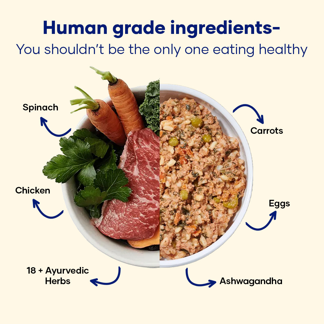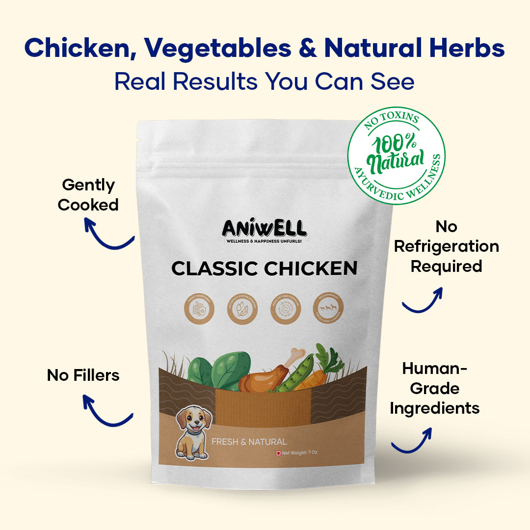 Aniwell Fresh Food offers a healthy, balanced meal for dogs with no refrigeration required. Made with premium, human-grade ingredients like real meat, eggs, and a blend of 18+ Ayurvedic herbs, this vet-recommended dog food supports digestion, immunity, and overall well-being.